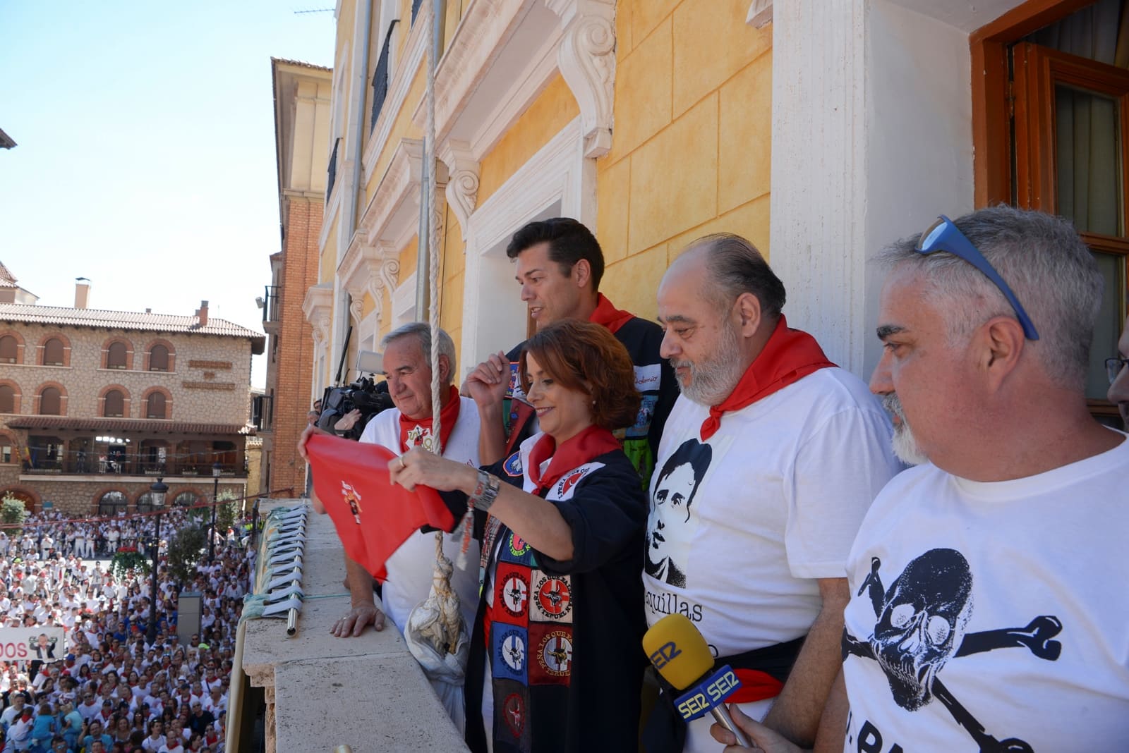 Es entonces cuando ocurre lo inevitable. Cuando ese enardecido vaquillero, en la cima del pedestal, anuda el pañuelico colorao a nuestro pequeño astado. Con el pulso tembloroso y aclamado por una inmensa marea blanca y roja le sellará un beso. Un beso que dura un instante pero que permanecerá toda la vida en su recuerdo. Un beso que desata la euforia de los miles de vaquilleros que inundan la Plaza del Torico que de blanquiroja se transforma en púrpura y que late con más fuerza que nunca. Que canta, que baila, que llora de emoción y que se abraza sin preguntar nombres. Porque durante tres días, todos somos parte de una misma familia, de una misma historia.